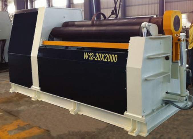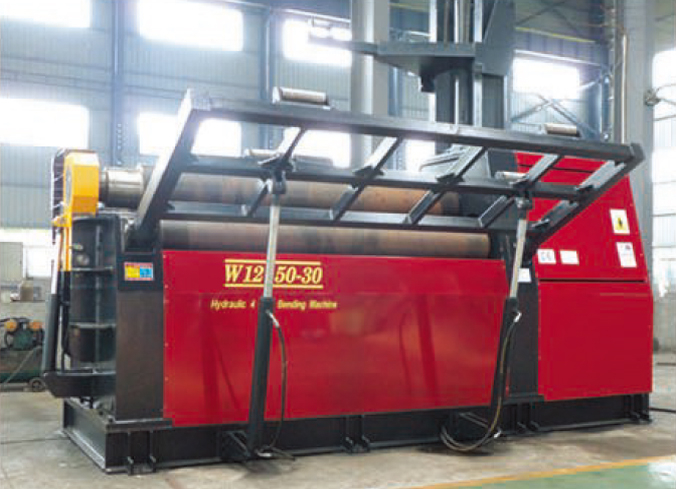 本機結(jié)構(gòu)型式為三錕對稱式,上輥在兩下輥中央對稱位置作垂直升降運動,通過液壓缸內(nèi)的液壓油作用于活塞而獲得,為液壓傳動;兩下作旋轉(zhuǎn)運動,通過減速機的輸出齒輪與下輥齒輪嚙合為卷制板材提供扭矩。本機床結(jié)構(gòu)緊,操作維修方便。
