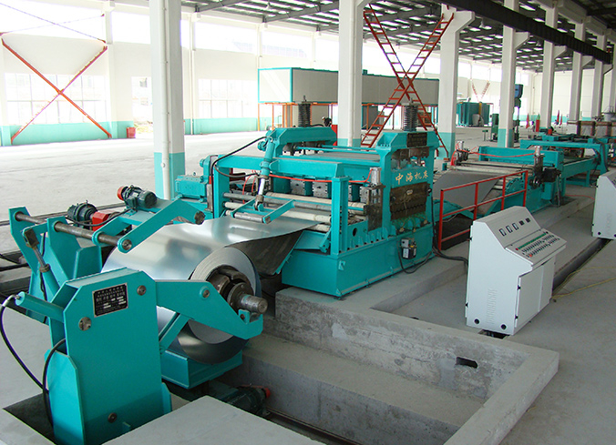 該生產(chǎn)線是將較薄金屬卷板整平、剪切成塊狀板材的專用設(shè)備。通常由上料小車、開卷機(jī)、托板壓引裝置、校平主機(jī)、活動過橋、導(dǎo)向糾偏裝置、定尺機(jī)構(gòu)、覆膜裝置、剪板機(jī)、輸送工作臺、氣動排料架、液壓升降垛料臺、運(yùn)料滾道臺及液壓系統(tǒng)、電氣控制系統(tǒng)等組成,協(xié)同動作PLC控制。